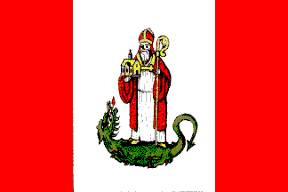 The municipal flag of Sint-Amands is vertically divided red-white-red (1:2:1). St. Amand stands in the white stripe, holding a crozier in the right hand and a church in the left hand and trampling a red dragon.