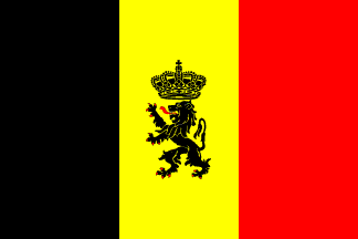 The Belgian black-yellow-red flag charged with a black crown and a black lion with red tongue and nails was the Naval ensign from 1936 until 1940 when the Belgian Navy was abolished. The Navy was re-established in 1949 and a year later a new Naval ensign was adopted. Since then the ensign with the lion and crown has been used as the state ensign.