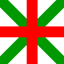 White triangular flag with a saltire consisting of a green bend over a red bend sinister.