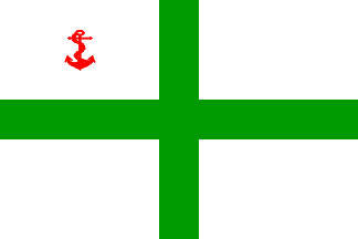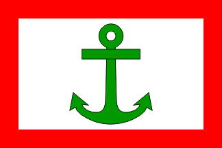 A white-green-red horizontal tricolour with white canton bearing crossed blue anchors.