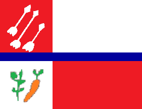 An off-centered quartered design in red and white, separated by a horizontal narrow blue stripe; three white arrows in the upper red field, two vegetables in the lower white field.
