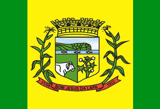An vertical triband, 1:4:1 green-yellow-green, with the municipal arms centred occupying the yellow stripe.