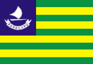 Horizontally banded in nine stripes green and yellow, a blue square canton extending five stripes, bearing the municipal arms.