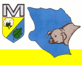 Horizontally divided 3:1 white over yellow, with a large map of the municipality in blue, bearing the front part of a pig, and in the hoist, the municipal shield topped by a grey letter M.