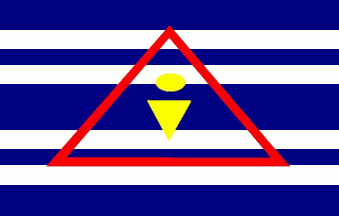 Horizontally striped blue and white, four white stripes, two and two with broader blue stripes above and between the pairs of white stripes, a red triangle outline centred, and inside it an inverted yellow triangle and above it a yellow ellipse.