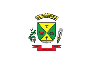 A Portuguese shield, quartered. In the first quarter, on a yellow background, a maize cob; in the upper quarter, a wine glass, representing viticulture; on the right, on a green background, a pig, representing a main source of income; in the left quarter, on a green background, a bovine, also a source of income for the municipality. The shield supported left and right by soybean and wheat plants fructed, representing the municipality's resources. Beneath the shield, a scroll gules (red) inscribed in black "1962 - Palm Filho - 1975". The design and its colors symbolize the people's spiritual and moral features and the national colors.