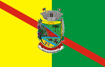 A vertical yellow-green bicolour, overlain by a narrow west-east descending red diagonal stripe and bearing the municipal arms in the centre.