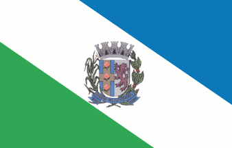 A descending diagonal tricolour, blue over white over green, bearing the municipal arms in the centre.