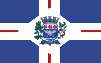 A blue flag with a broad white upright cross, overlain by a narrow dark red cross, and with the municipal shield centred in a white lozenge.