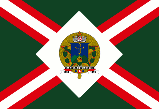 A freen field with a white saltire bordered red, and the municipal arms on a white square centred and rotated on to point.