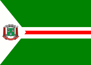 A green flag with a white-red-white horizontal stripe across the centre, and a white triangle extending from the hoist bearing the municipal arms.