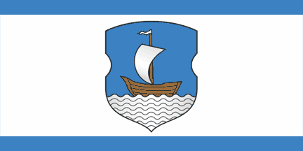 White flag, narrow blue borders at top and bottom, in centre a shield displaying a small sailing boat with white sail.