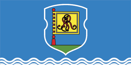 Blue flag, three white wavy stripes along the bottom, white-edged blue shield bearing a yellow flag on a red pole, with a monogram in red, on a green base.