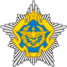 The official description is: The heraldic badge - emblem of  Air Force and Air Defence Corps of Belarus represents stylized golden images of  arrow, lightnings and wings combined with a wreath from golden oak and laurel branches, located in the center of a figured blue shield (baroque type), golden bordered and topped with a five-pointed golden star. This shield is located on a silver medal star.