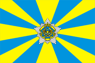 The emblem  responding to 2/5 of the total flag width is placed on a blue field of flag with yellow beams. This emblem of Belarusian Air Force and Air Defence Corps  has been authorized on April, 22, 2003 by the Decree number 163 of Presidents Mr.Alexander Lukashenko.