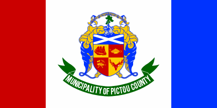 The flag of the Municipality of the County of Pictou, Nova Scotia, consists of three vertical stripes of red-white-blue, where the white stripe is wider, and the county coat of arms in the middle of the white stripe.