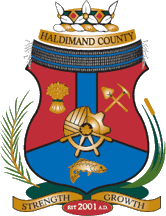The flag of the Haldimand County, Ontario, is green with county logo on it. The Great Blue Heron silhouette pays homage to a species often found in the County. The rolling hill in the background represents the banks of the Grand River and Lake Erie's shoreline and the flowing water represents these bodies of water that figure prominently in the geography, history and everyday life of Haldimand County residents and visitors. The Maple Leaf ties us to the Canadian identity and the tagline "A Grand Experience" is a play on words that mentions the Canadian Heritage Grand River and also describes the experience that we hope visitors and residents of the County can enjoy. Information and photo of the flag thanks to Jeff Ballin, Marketing & Promotions Coordinator, Haldimand County.