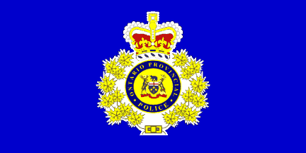 The flag of Canada's Ontario Provincial Police is plain blue with the service badge fimbriated in white at the centre. The service badge comprises the full coat of arms of the province of Ontario at the centre on a yellow field within a blue circular title-scroll with the text "Ontario Provincial Police" in yellow. These are placed within a wreath of gold maple leaves, and surmounted with the St Edward's crown. The police flag is flown in third position at their headquarters, preceded by the Canadian national flag and the provincial flag of Ontario.