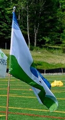 Flag is the county logo on white, with wavy blue and green stripes at the top and bottom.