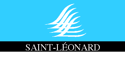 I have personally only seen the logo flag flying in the late 1990s, but I have seen the white flag with coat of arms in a Montreal Urban Community building in 1999. Beaudoin reports two flags: a 1:2 blue-white-blue triband with the arms on the white stripe, and a flag with a former logo. The more recent logo was adopted on August 23 1988, and was conceived by Robert Jalbert. In the logo, one can distinguish the letters VSL for Ville de Saint-Léonard. Its configuration evokes movement, dynamism and strength, and imposes itself by its symmetry, while its four elements form an unbreakable whole, suggesting multiculturalism, municipality services and green spaces confined between the four cardinal points. The arms were adopted in 1963 by the municipal council, while the logo was adopted in 1988. The symbolism of the arms is as follows: the French shield reflects the roots; the sinister part reflects the past, the cross and the fleur-de-lys referring to a Catholic French-Canadian community, while the wheat and celery represent agriculture; the tree, house and factory on the dexter part reflect the city's determination for balance and harmony between ecology and socio-economic environment; the beaver on the bottom part suggests the past's activities and support for the future; the mural crown is a symbol of civic authority; the motto reads "RES NON VERBA" meaning 'action, not words'; the maple leaves symbolize belonging to Canada.