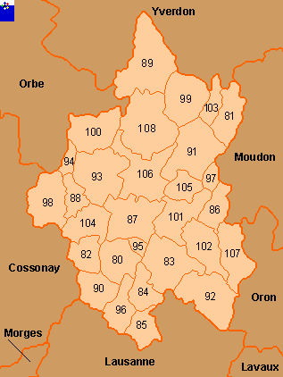 Legend key: 80 Assens 81 Bercher 82 Bioley-Orjulaz 83 Bottens 84 Bretigny-sur-Morrens 85 Cugy 86 Dommartin 87 Echallens 88 Eclagnens 89 Essertines-sur-Yverdon 90 Etagnières 91 Fey 92 Froideville 93 Goumoëns-la-Ville |