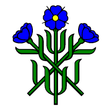 Argent three Flax flowers Azure seeded Or slipped and leaved Vert in saltire and in pale.