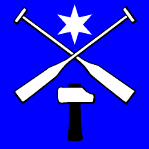 Azure in base a hammer Sable headed Argent in chief two oars in saltire below a mullet of six also Argent.