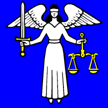 Azure Justicia Argent stantant blindfolded and winged holding in dexter a sword upright hilted and pommeled Or and in sinister scales of the last.