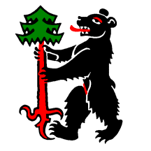 Tierced Argent in chief a chevron raised and a ibex rampant all Sable three embattled towers of Second issuant from a coupeaux Vert in base a bear rampant also of the Second langued Gules and holding a pine tree Vert trunked and eradicated of the Fourth.