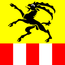 Or an Ibex rampant Sable and a base paly Gules and Argent.