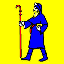 Or St. Jakobus passant clad Azure holding in dexter a Crozier Gules and in sinister a Bible of the first.