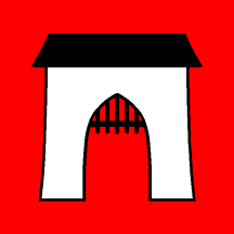 Gules a three-peaked mountain Argent surmounted in base by a women's gate Sable.