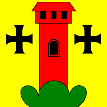 Or, issuant from Coupeaux Vert a Tower Gules windowed Sable between two crosses pattee of the last.