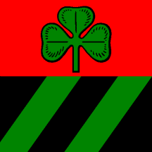 Per fess Gules a Trefoil slipped Vert and Sable two bends sinister of the second.