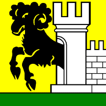 Or on a Base Vert issuant from sinister a Semi Castle Argent with tower with entrance from which is issuing a Semi Ram Sable.