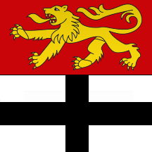 Under red shield head, covered with striding yellow lion, in white a black cross.