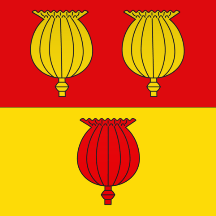 Divided by red and yellow with three (2,1) poppy capsules in alternate colours.