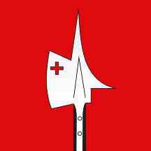 Party per saltire by black and red, covered by white cross extending to the edges.