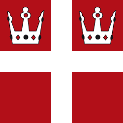 In red, a white cross reaching to the edges, two white crowns at the top.