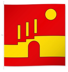 Serravalle's emblem shows a crumbling wall with a round gate opening, as can actually be seen in the ruins. The crumbling wall is surmounted by three bars, which presumably represent the three communities that joined together. The circular object is not clear either. Is it part of the ruins, the sun or the full moon?