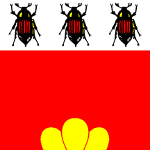 Gules, a triple mount Or, in chief Argent three May-beetles proper.