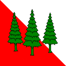 Per bend Argent and Gules, overall three Pine-trees Vert.