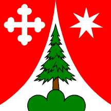 Gules on a pile inverted embowed Argent issuant from Coupeaux Vert a Pine