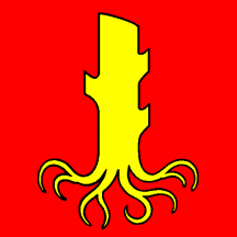 Per bend Argent a Trefoil slipped Vert and Azure a Ploughshare in bend of the first.