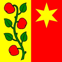Impaled Or an Apple Branch leaved Vert and fructed Gules and Gules in chief a