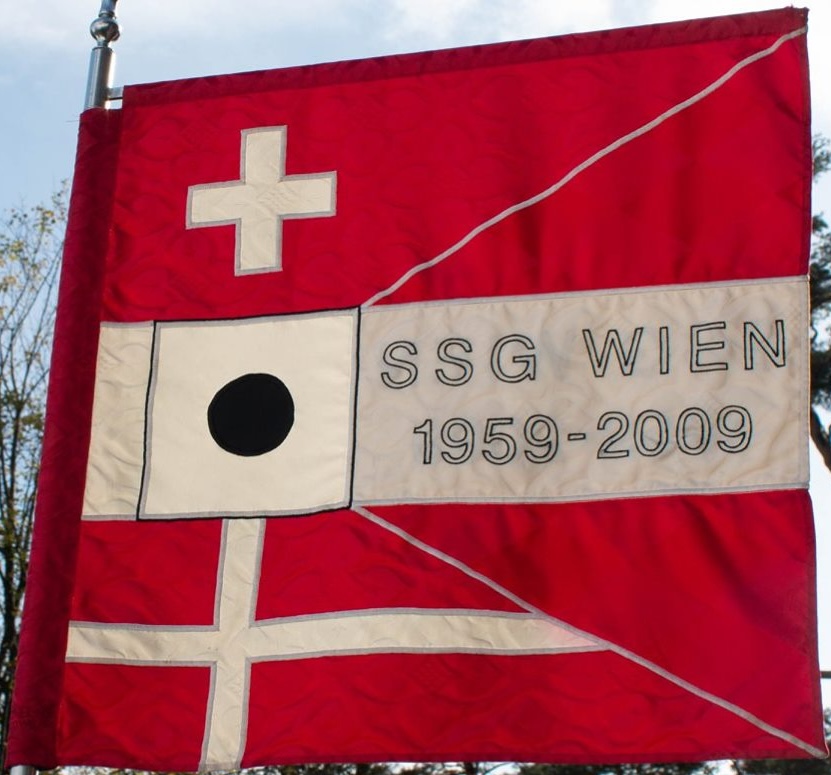 The flag contains the emblems of Switzerland and the state and city of Vienna.