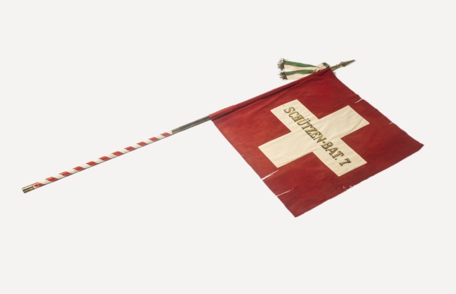 Flag of 7th Thurgau Shooters Battalion (Regulation of 1912, 107x109 cm), with cravat in cantonal colours. On the reverse side the name of the Canton. Location: Historical Museum Thurgau, Frauenfeld (source).