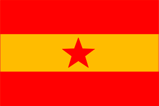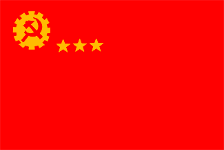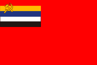 Designed jointly designed by Zhang Ding and Zhong Ling. The red, yellow, red horizontal three stripes with yellow fimbriated red star in top stripe, red crossed hammer and sickle in middle stripe and yellow three stars in bottom stripe.