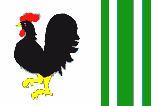 From Exner's VexLex1997 the flag of Proseč (or Proseč u Skutče) in Chrudim district, Pardubice region in Czechia - a crowing flag, and the cockerel is unaware of what's on top of him on the Coat of Arms at this webpage - kukelekuuuu! Flag adopted 17 Oct 1997.