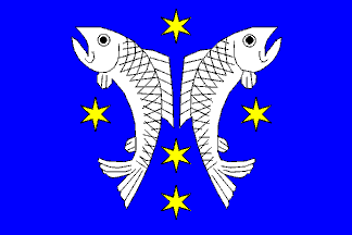 Flagdescription: blue field, in center two addossed white fishes, surrounded by 5 5-pointed stars.